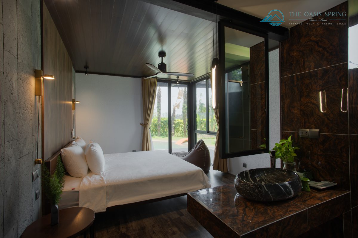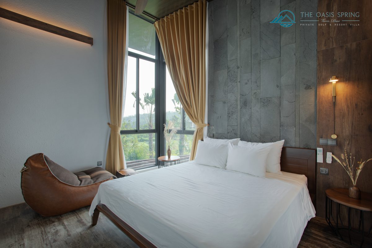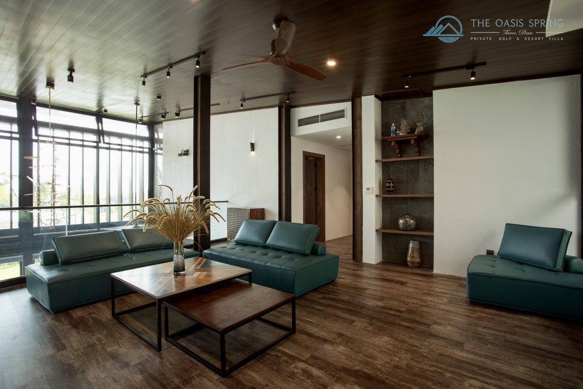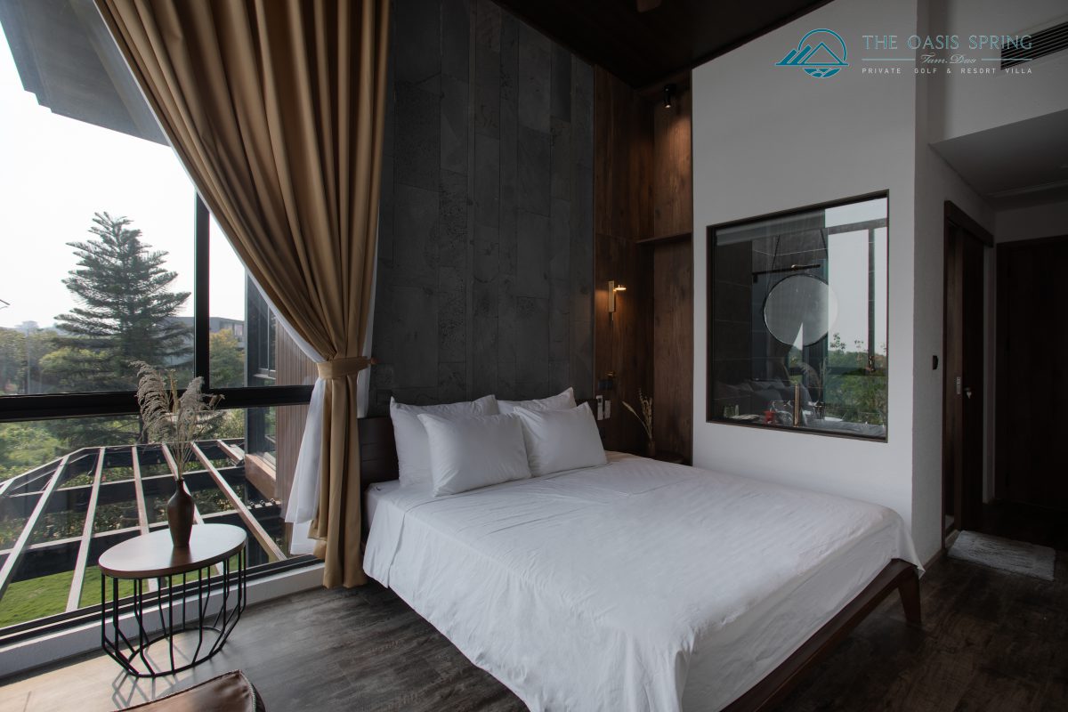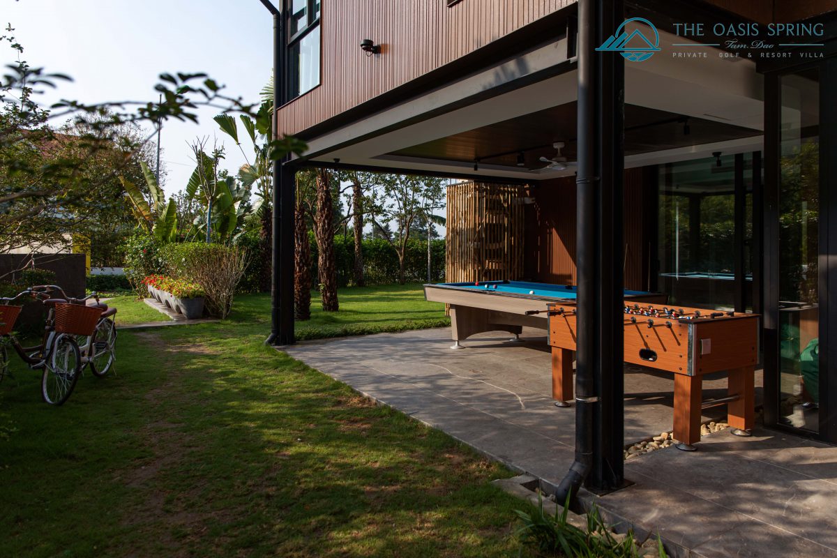 – Hai tầng nổi với 1 phòng khách, 5 phòng ngủ, phòng ăn, phòng vui chơi (Bi-a, karaoke…). Đặc biệt phòng ngủ được thiết kế rất gần gũi với thiên nhiên, luôn tràn ngập không khí trong lành của Tam Đảo và view không gian xanh cực đẹp nhìn thẳng vào sân Golf.