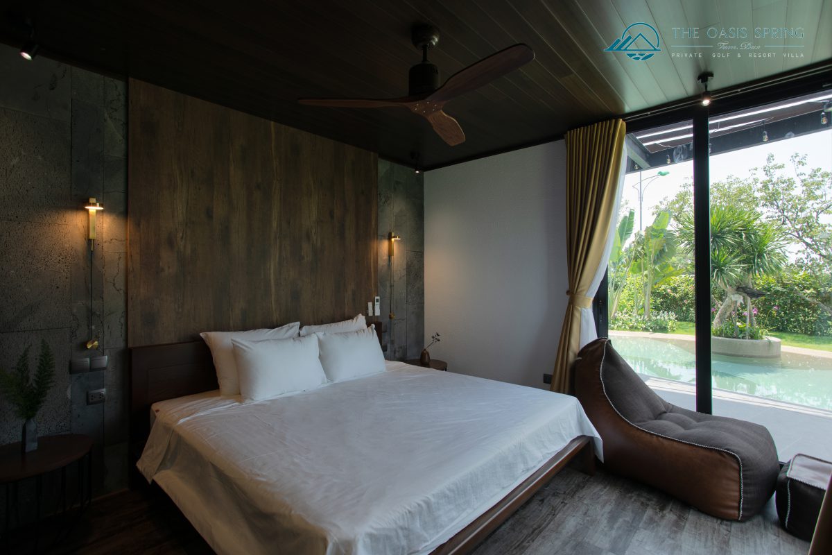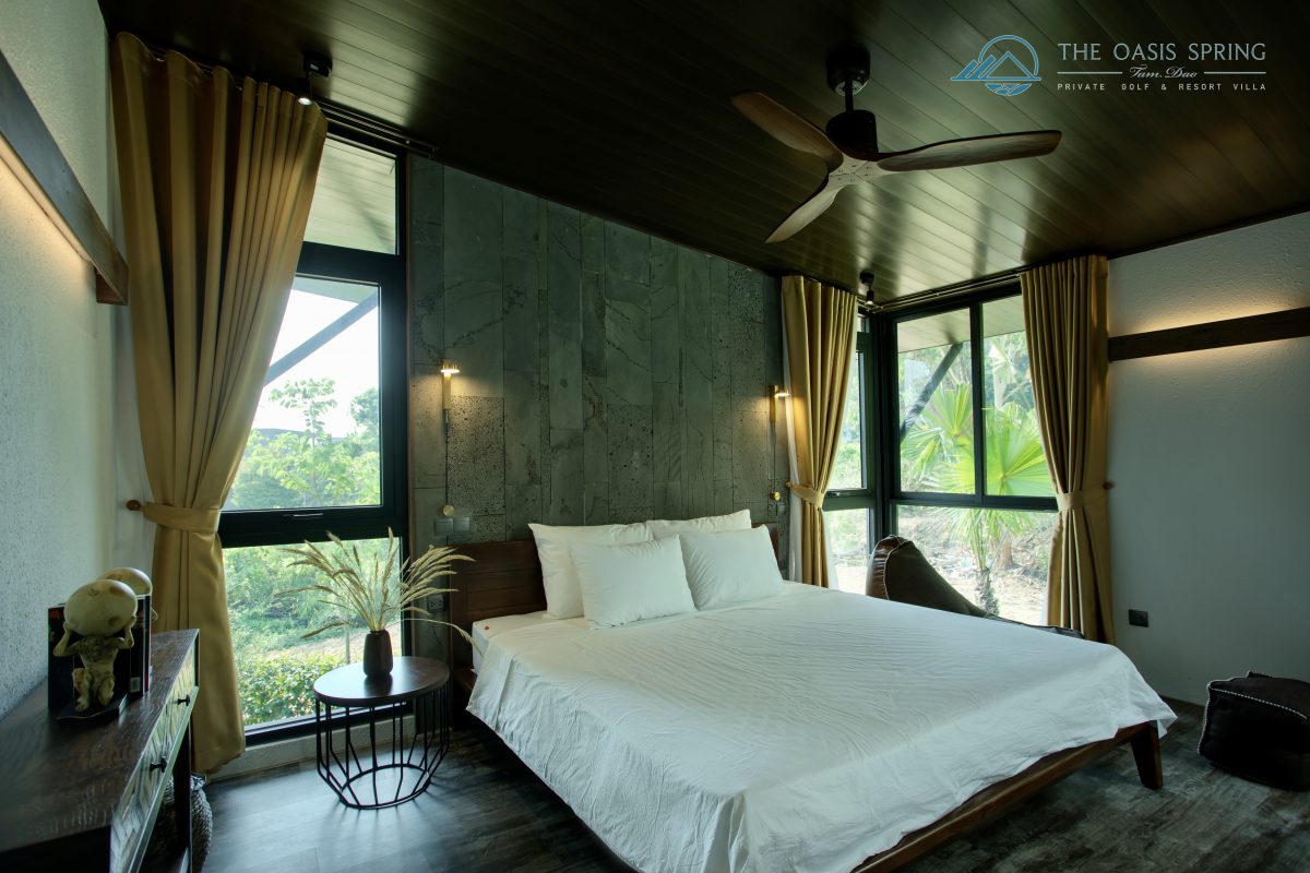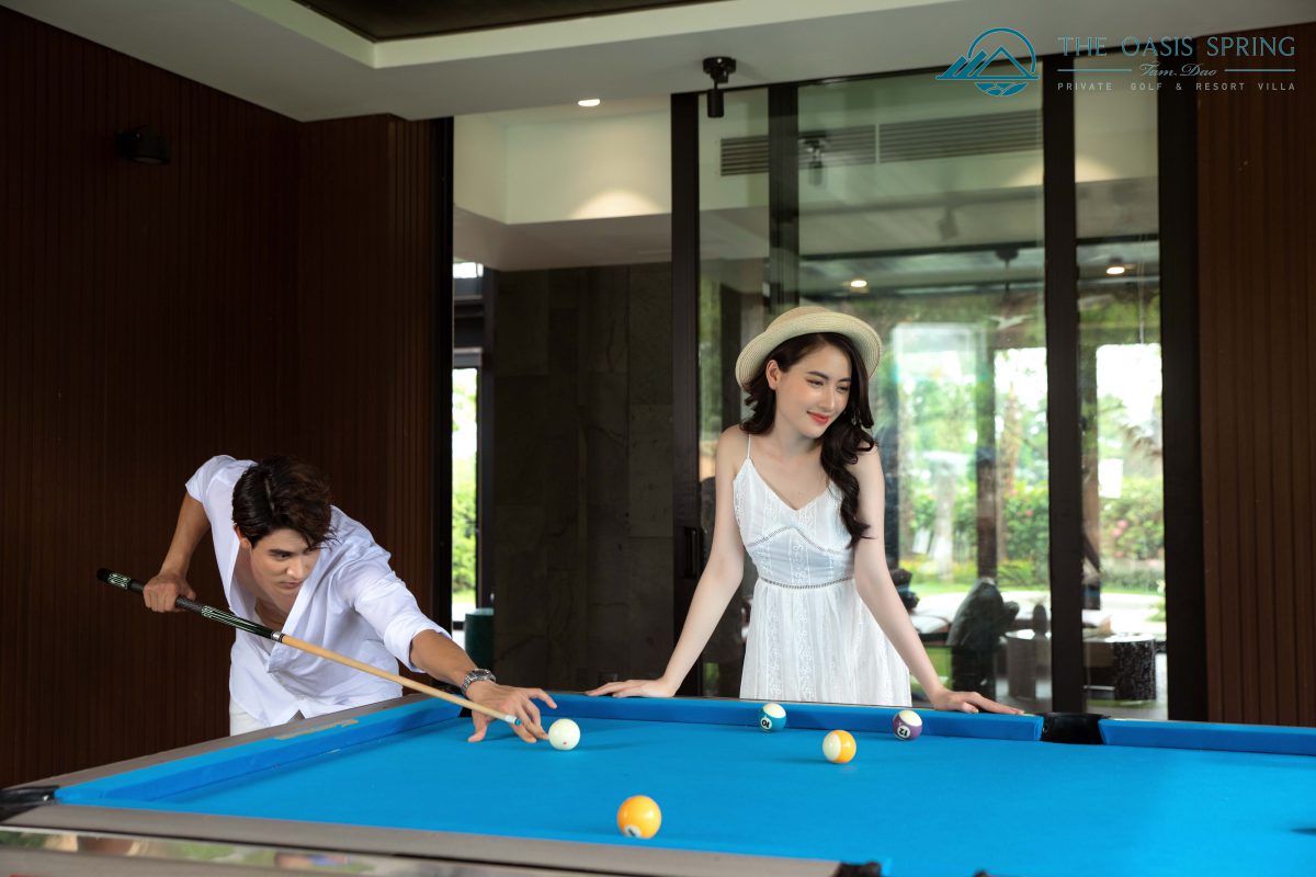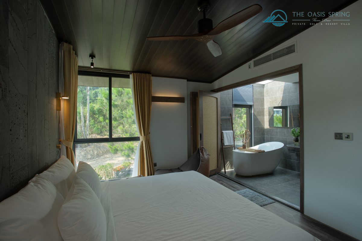 – Hai tầng nổi với 1 phòng khách, 5 phòng ngủ, phòng ăn, phòng vui chơi (Bi-a, karaoke…). Đặc biệt phòng ngủ được thiết kế rất gần gũi với thiên nhiên, luôn tràn ngập không khí trong lành của Tam Đảo và view không gian xanh cực đẹp nhìn thẳng vào sân Golf.